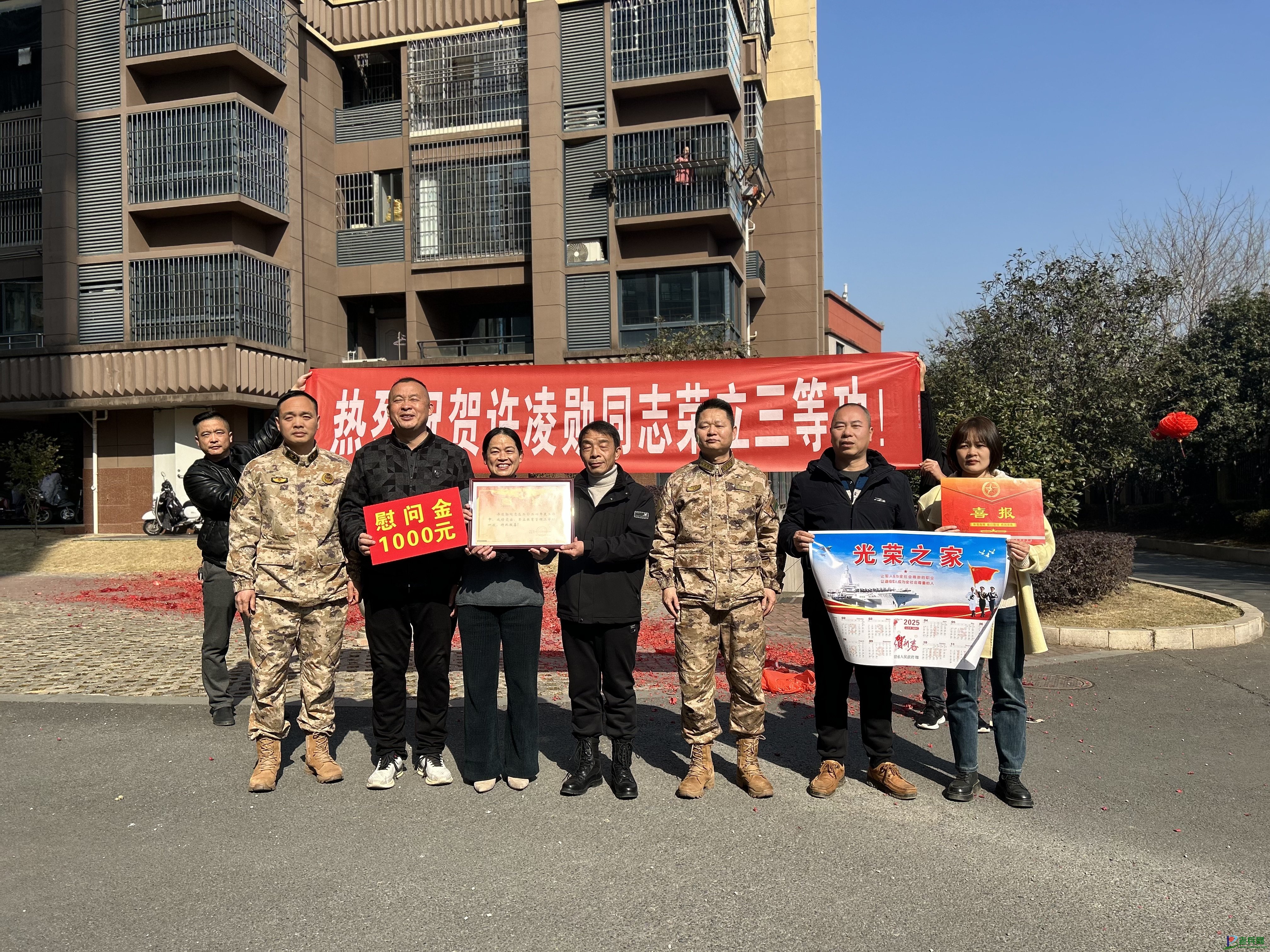 在热烈连绵的爆竹声中慰问组一行来到许凌勋家中,许凌勋家人们早就在门口翘首以盼,眼神中闪烁着激动与自豪。慰问组为其父母送上喜报和慰问金,并详细询问他们的生活近况,对许凌勋同志荣立三等功表示祝贺。“这份荣誉属于部队的培养,更离不开家乡父老的支持!”许凌勋父亲神色难掩激动,颤抖的双手接过承载着荣光的喜报。母亲眼含热泪表示:“孩子能立功报国是我们全家的骄傲,希望他在部队继续努力,再立新功!”
