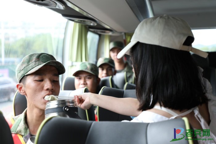 新兵为家长整理光荣家属绶带