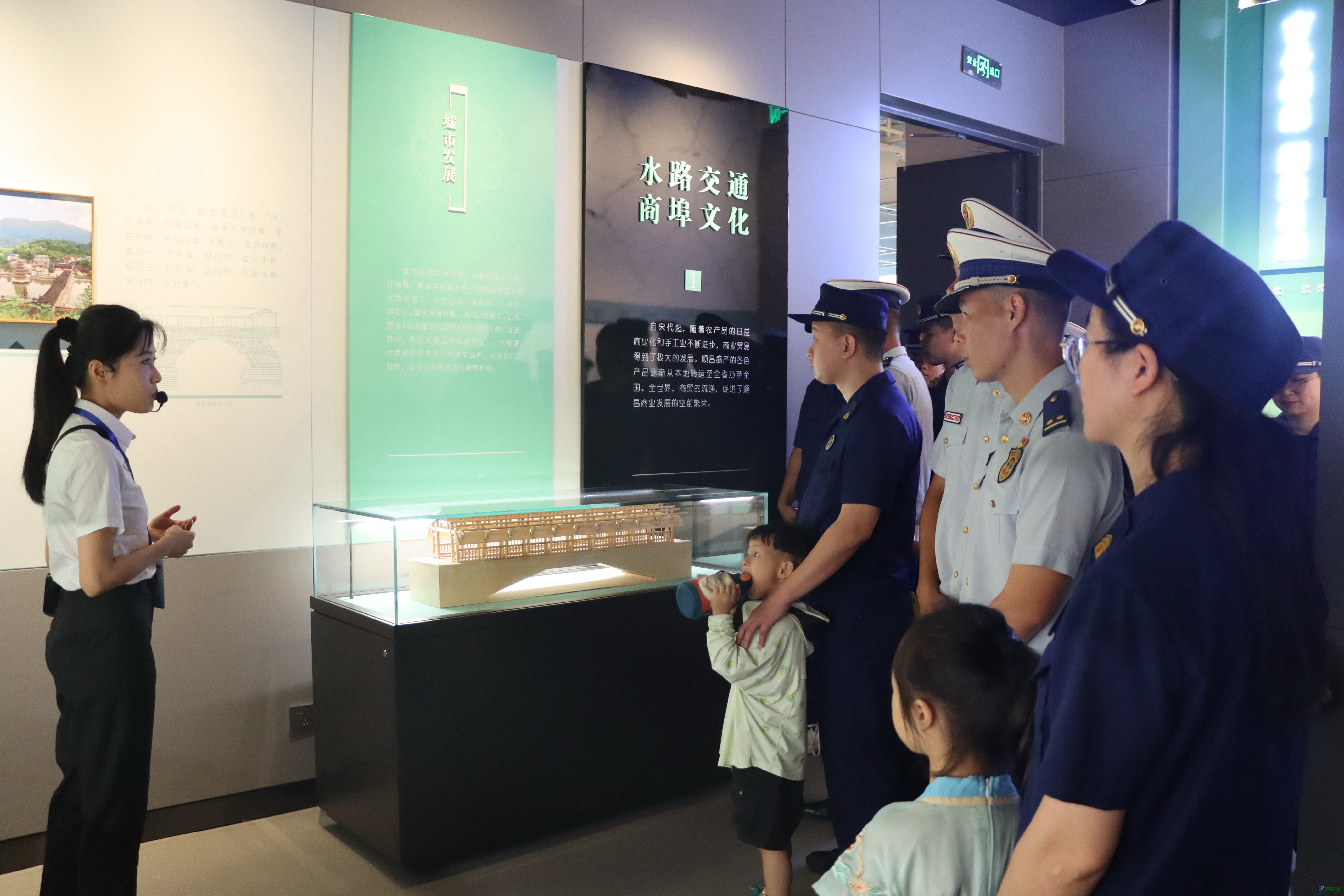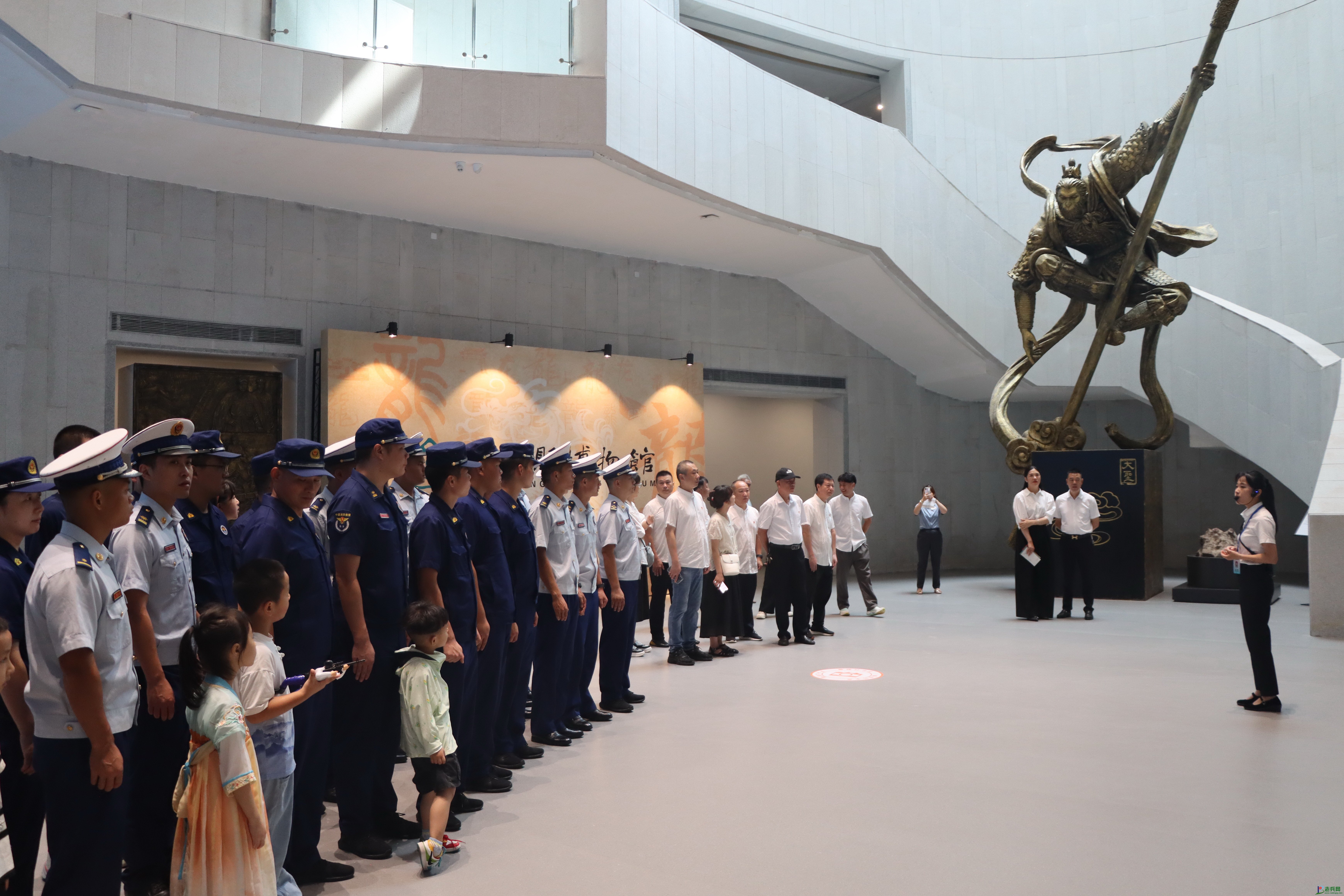 消防救援人员及其家属和子女在博物馆大厅聆听讲解员讲解
