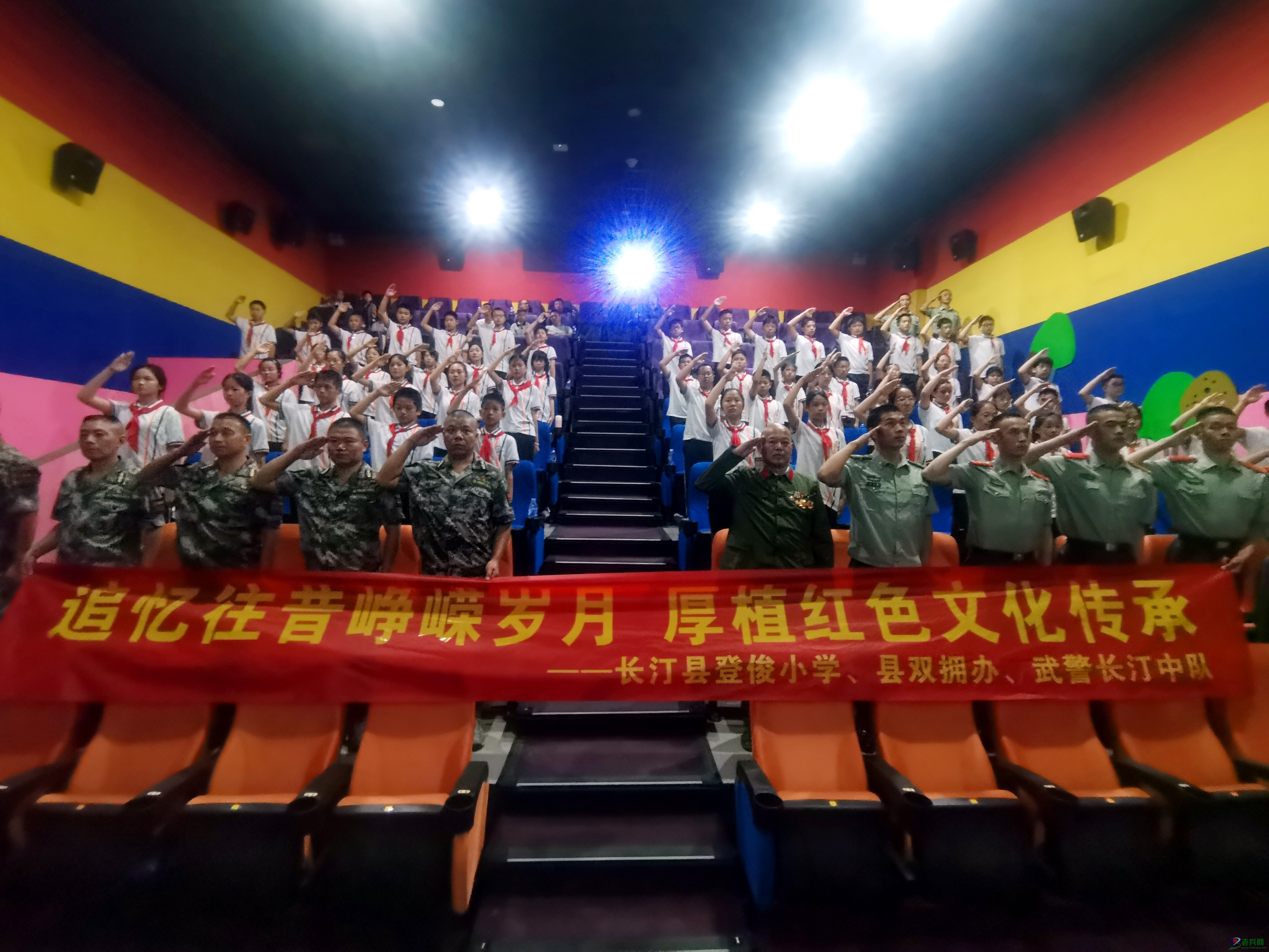 (武警官兵、退役老兵们和学生们统一起立,向屏幕里的英雄敬礼)