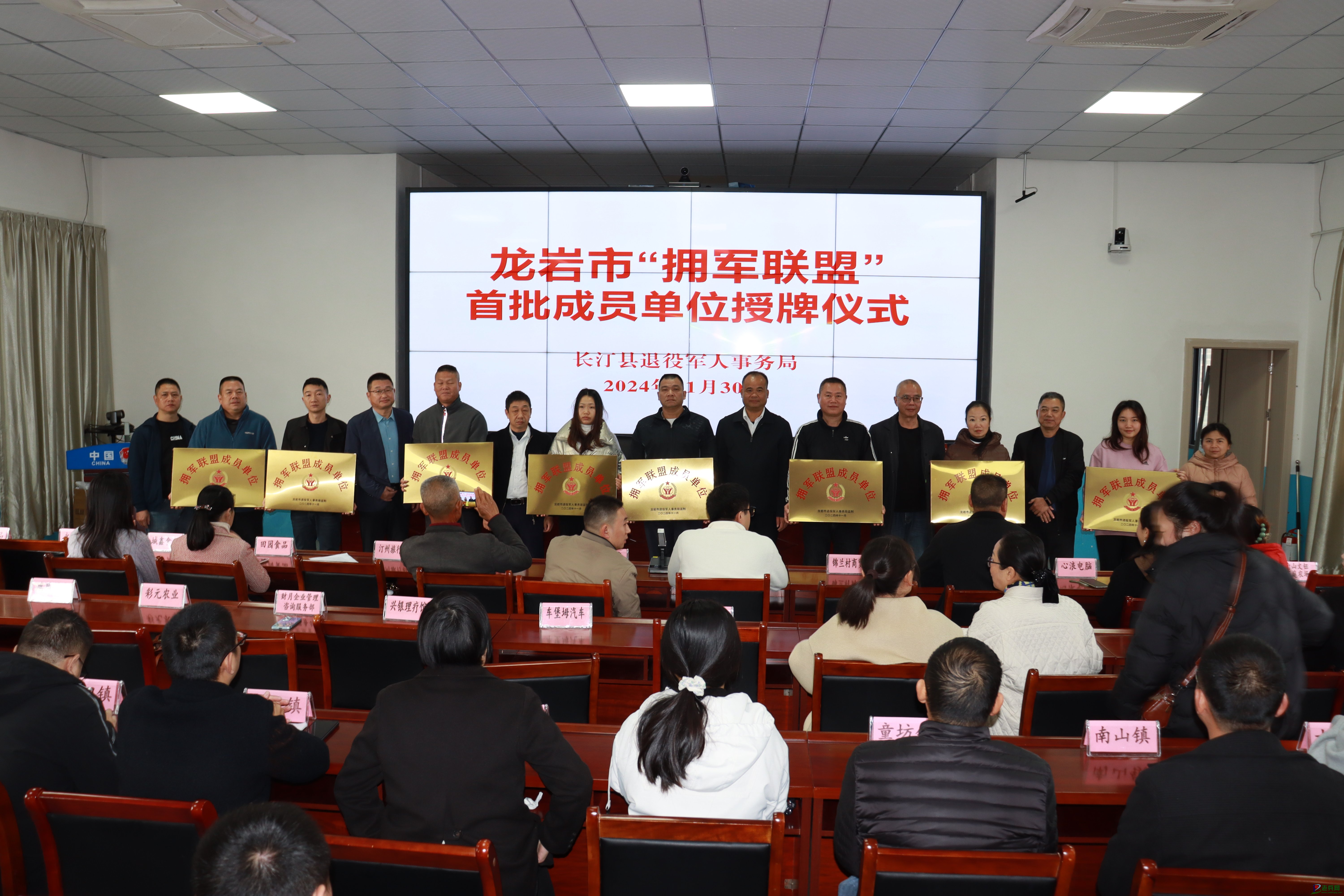 为进一步弘扬拥军优属的光荣传统,广泛吸引社会力量参与爱国拥军活动,推动社会化拥军工作向纵深发展,11月30日,长汀县退役军人事务局组织开展拥军联盟成员单位授牌仪式,县退役军人事务局领导班子成员和28家龙岩市首批“拥军联盟”成员单位代表参加授牌仪式。