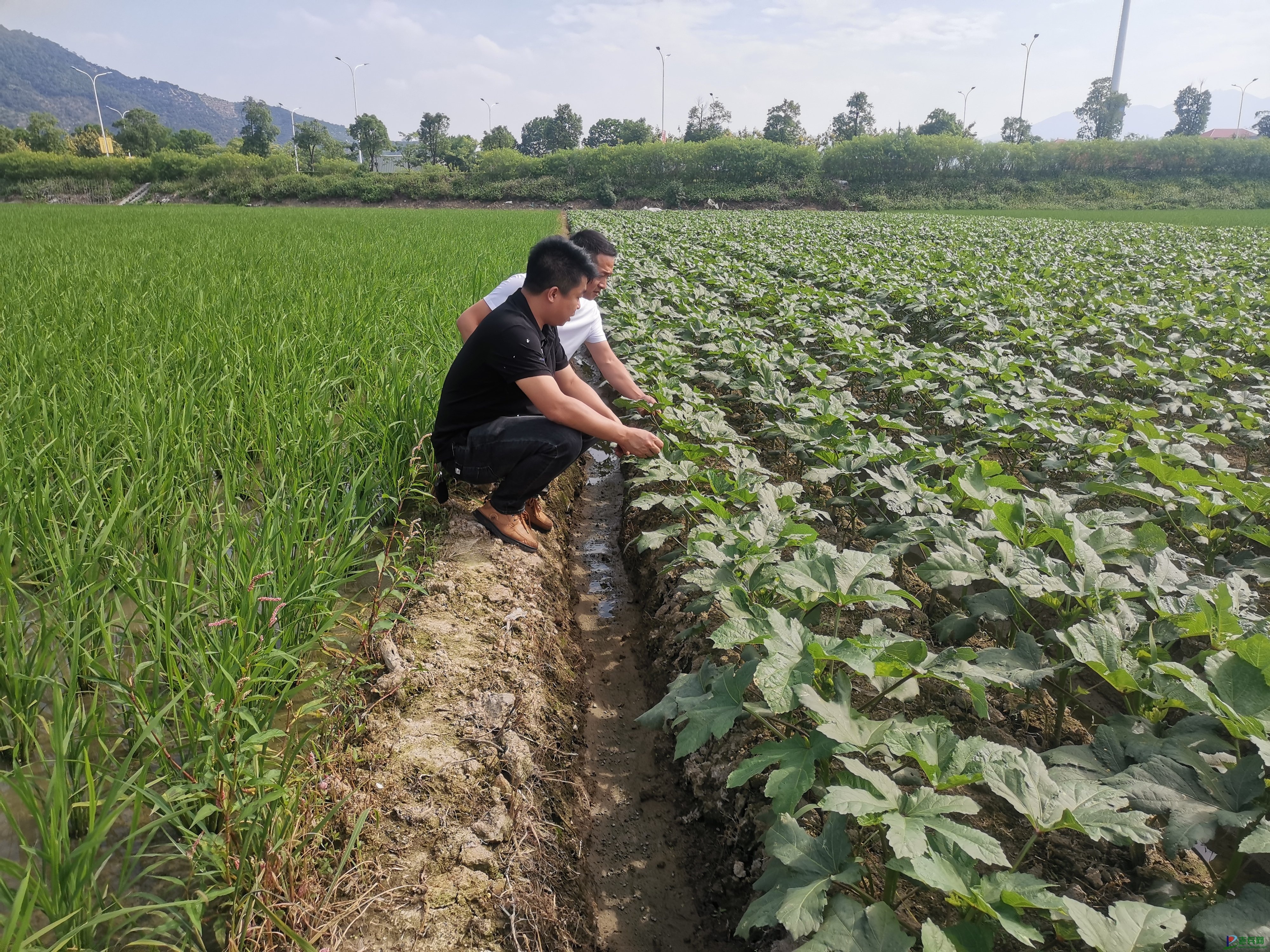 到田地查看黄秋葵生长情况