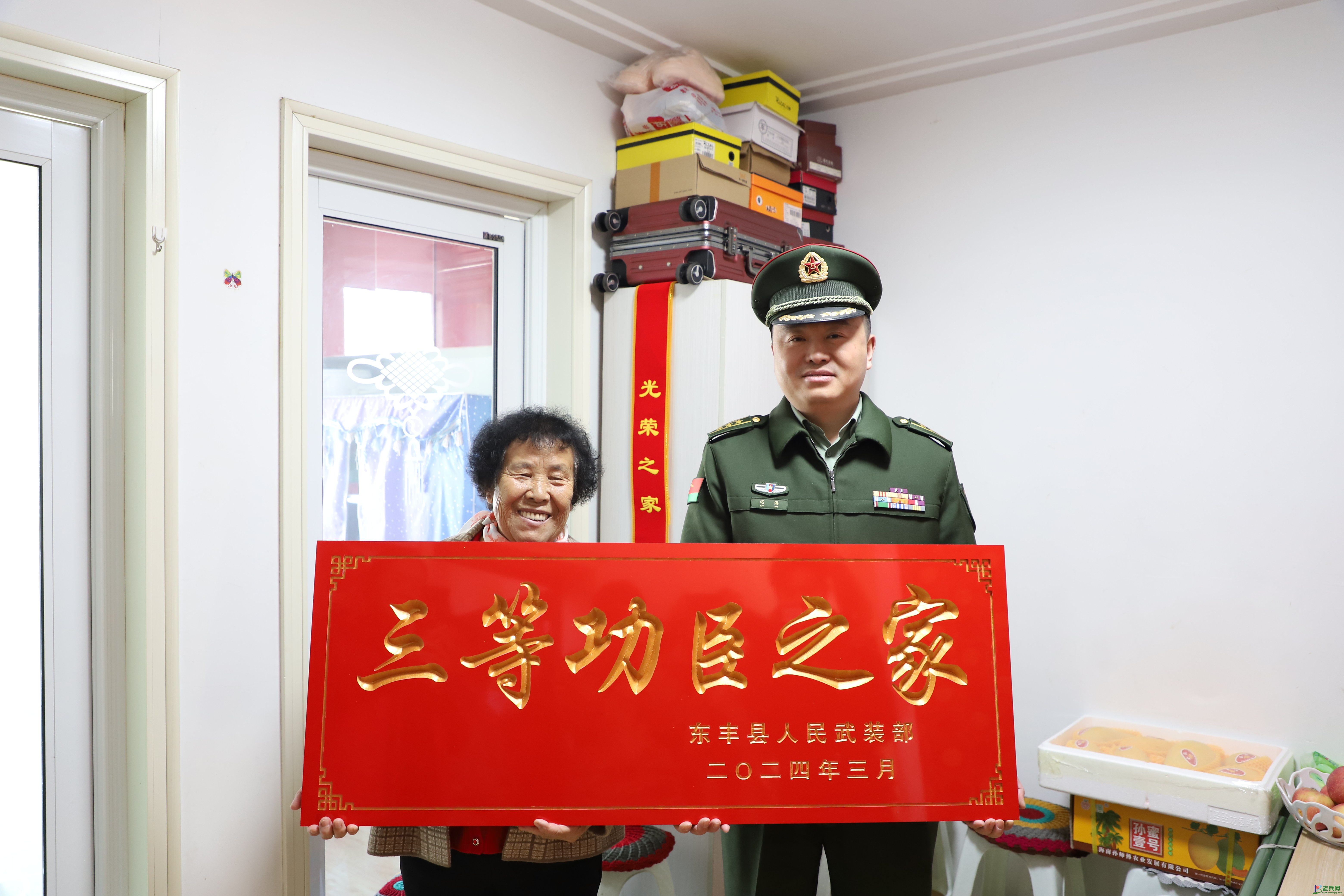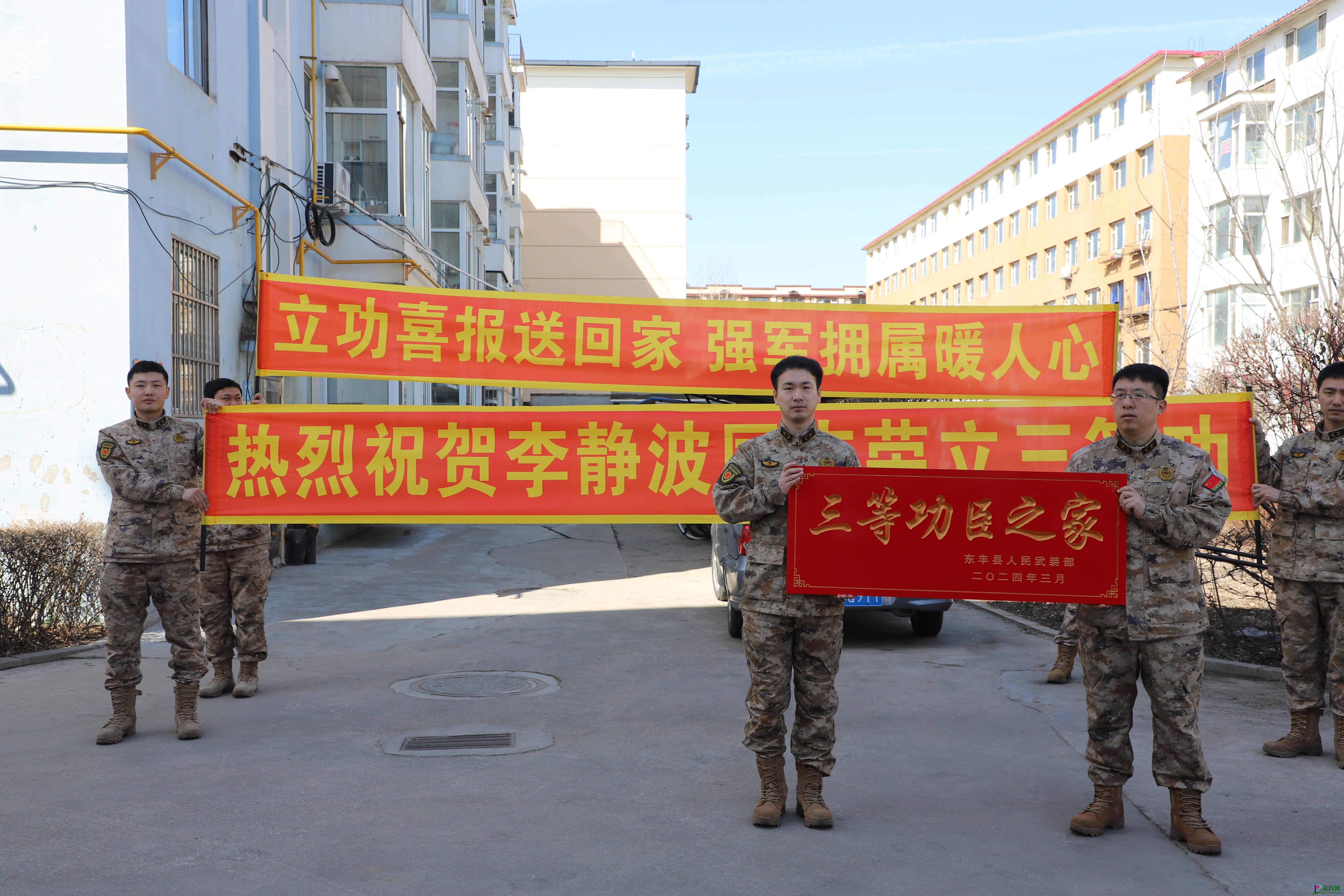 近日,吉林省东丰县人武部携手退役局为东丰镇现役军人李静波家颁发三等功之家荣誉牌,彰显党和政府对军属的关怀和对军人的尊崇。