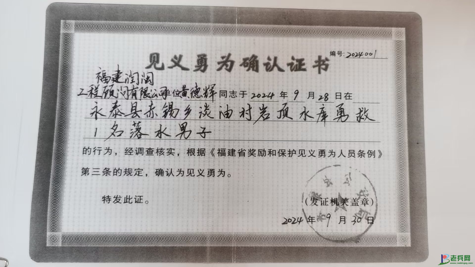 黄德辉的见义勇为确认证书,程张寰摄。