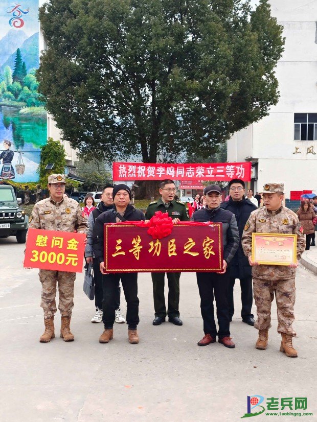 为现役军人李鸣家庭送三等功喜报