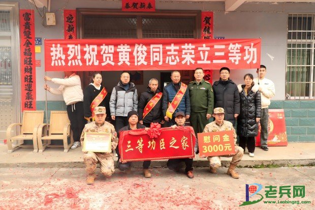 为现役军人黄俊家庭送三等功喜报
