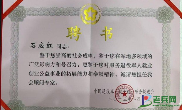 2025年2月,中国退役军人就业创业服务促进会诚请老兵网总裁石应红担任促进会顾问专家。(来源:老兵网 作者:张毅)