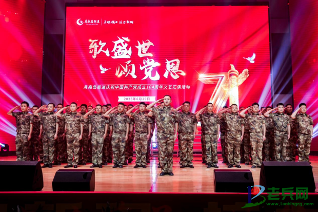 “向前!向前!我们的队伍向太阳!”6月29日,长郡白石湖中学礼堂内党旗猎猎、歌声激昂,月亮岛街道庆祝建党104周年活动在庄严热烈的氛围中隆重举行,由退役军人组成的合唱团,36名身着旧军装的老兵挺立如松,用两个月排练出《长征组歌》选段,献唱《强军战歌》。参与合唱的79岁抗美援朝老兵手指微颤,胸前勋章与舞台灯光交相辉映。“当年跨过鸭绿江唱的就是这首歌”,他沙哑的嗓音引得台下年轻民兵泪光闪动。