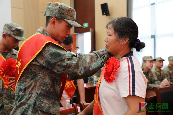 新兵为家长整理光荣家属绶带