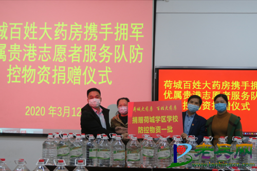 3月12日,广西贵港荷城百姓大药房携手拥军优属贵港志愿者服务大队,向港北区教育局荷城学区管理办公室以及11所中小学、3所幼儿园捐赠防疫物资,助力学校防疫工作,为师生健康保驾护航。3月22日,志愿者服务队又向贵港的养老院捐赠防疫物资一批,为院里老人健康保驾护航,上午由李文勇、戴健峰等志愿者分别为市内及城乡各家敬老院送去。(来源:老兵网 作者:易舟芹)