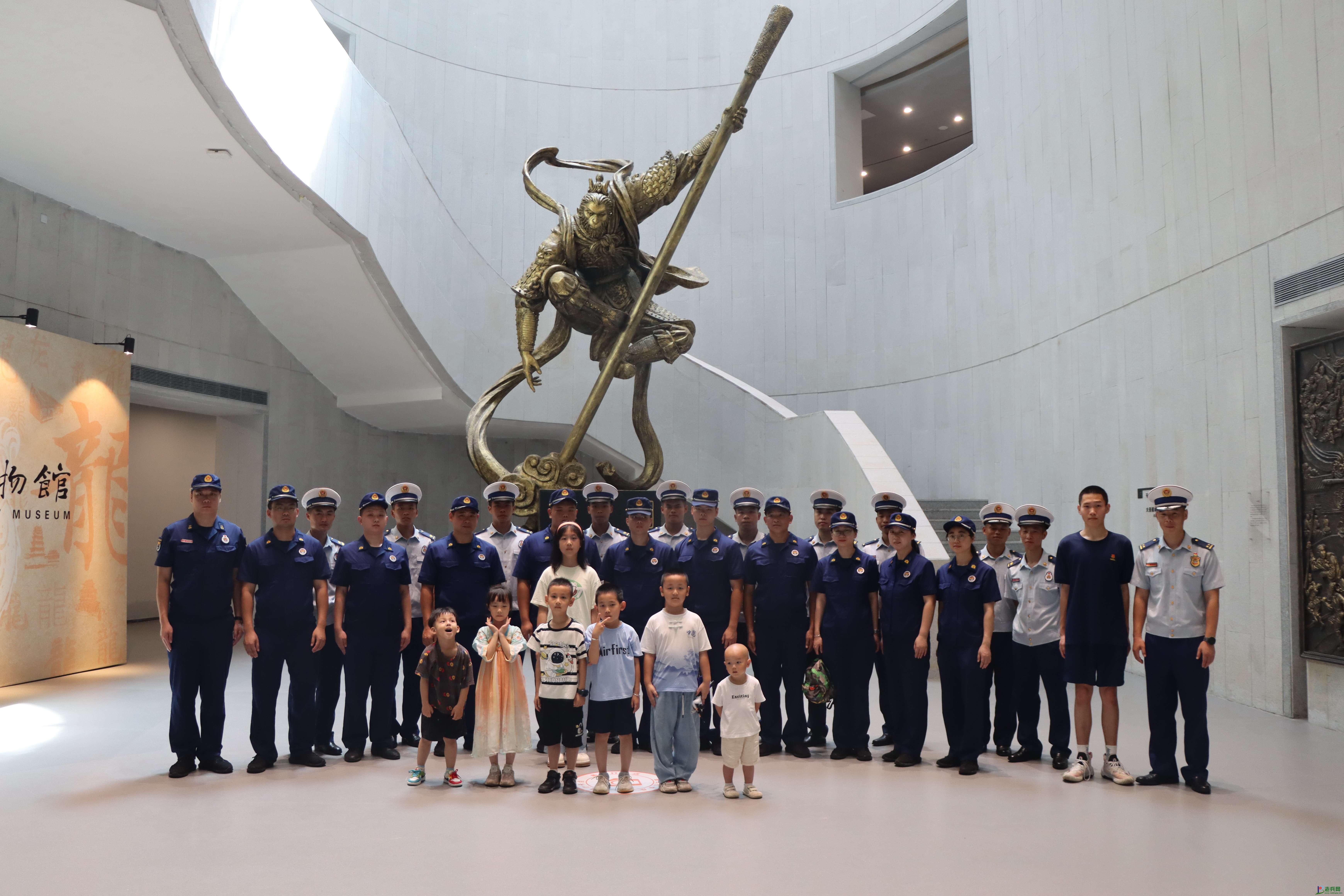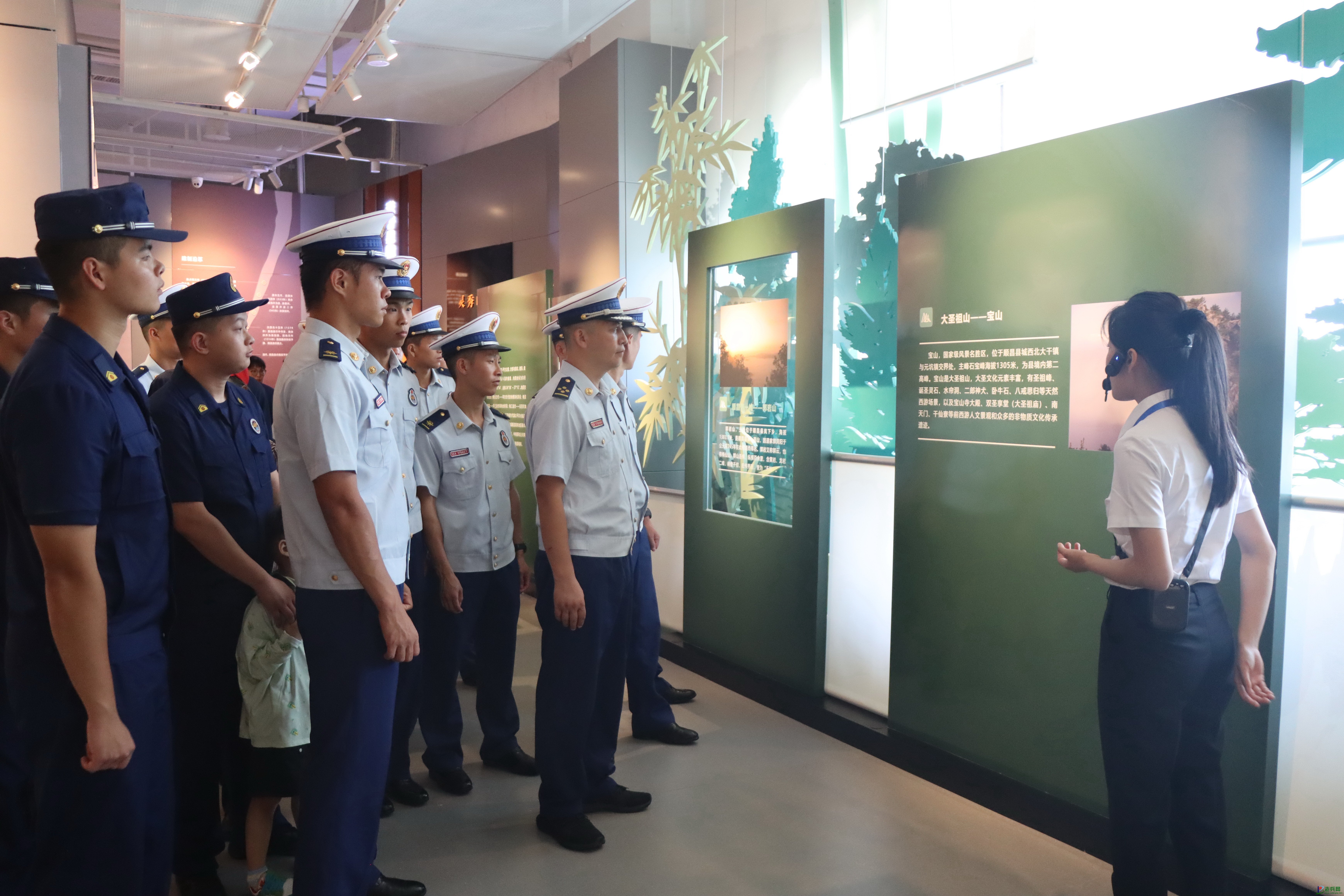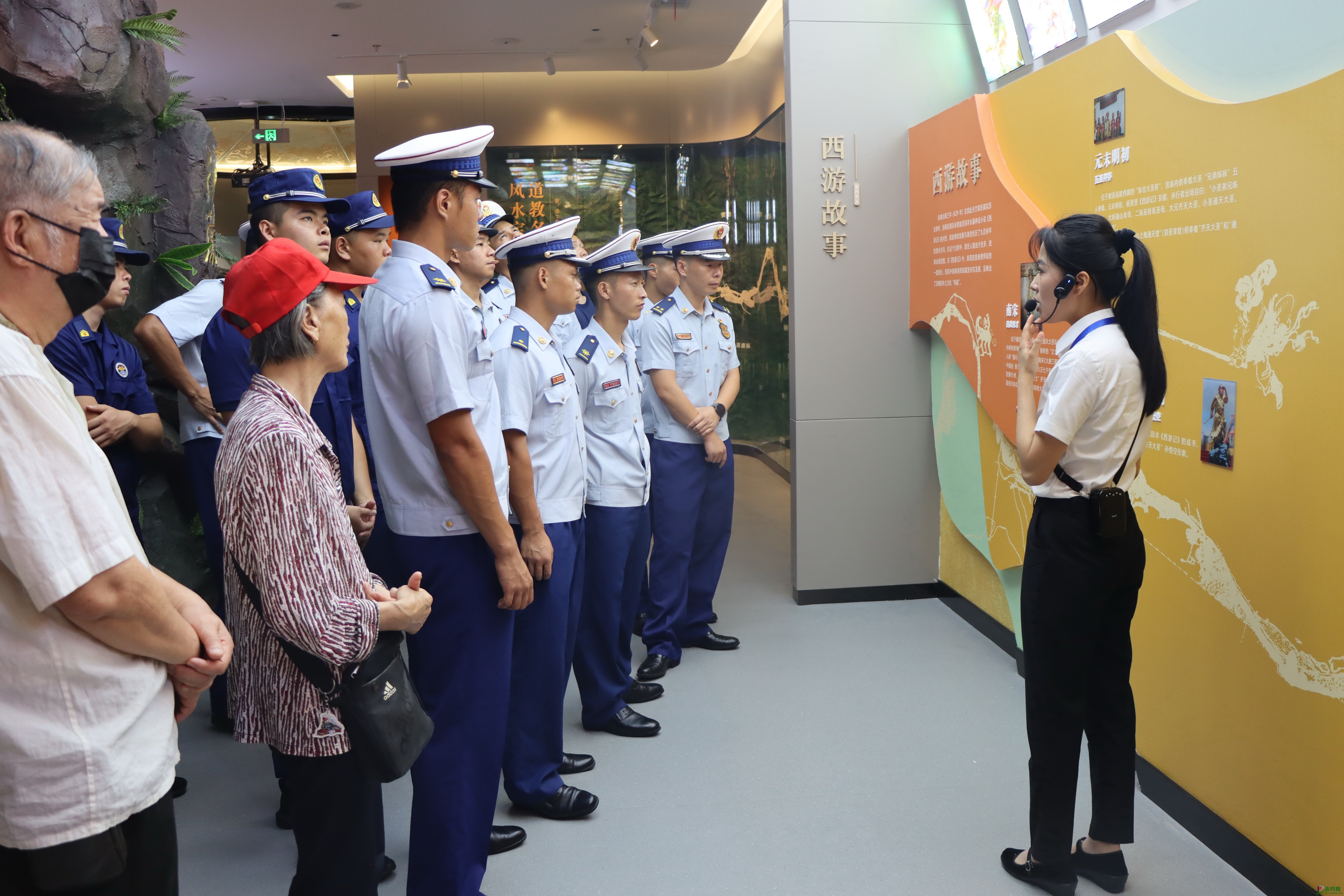 消防救援人员及其家属和子女在博物馆大厅聆听讲解员讲解