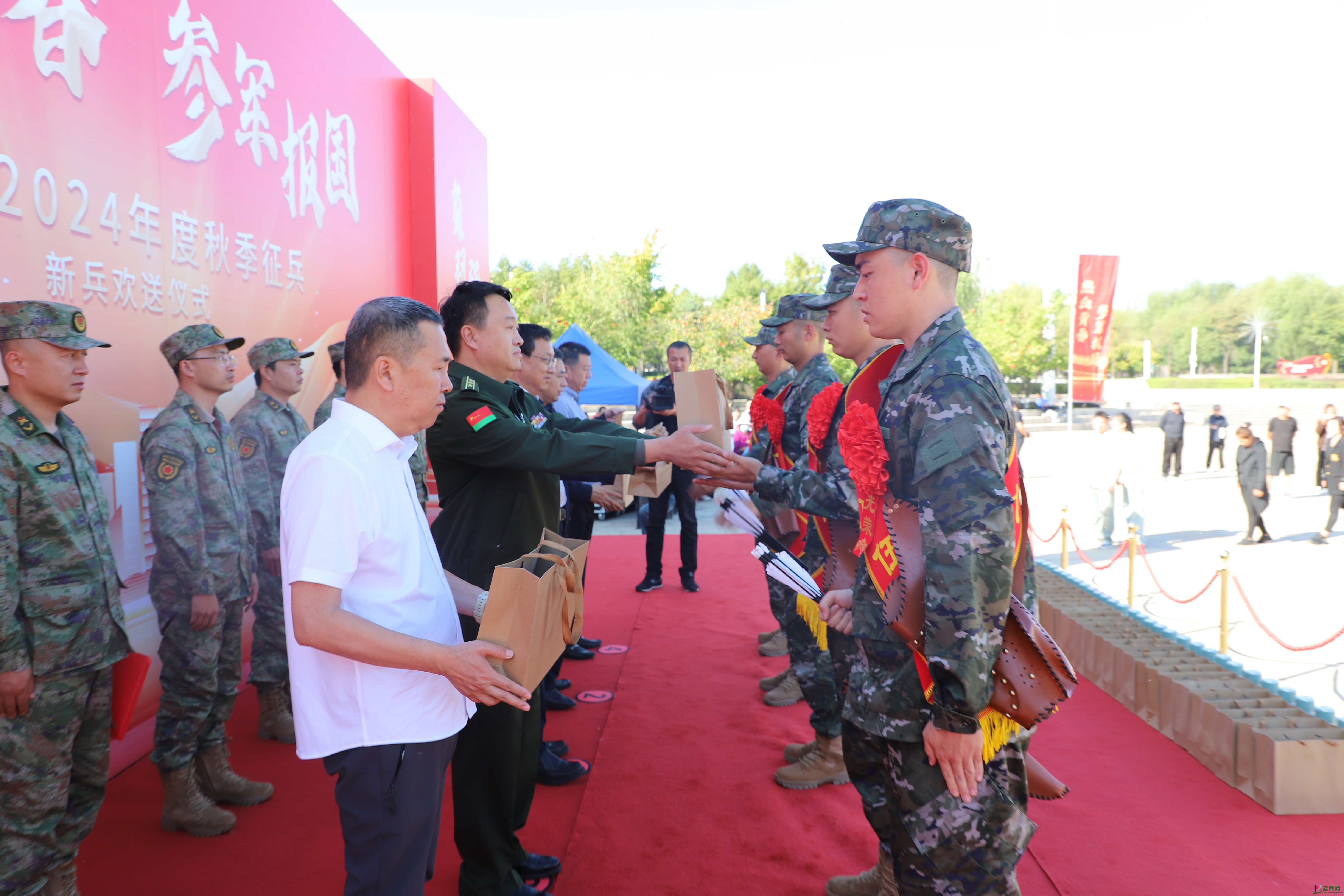 与会领导向新兵赠送了礼物,鼓励他们为家乡争光。家长们将象征着国防精神的“国防弓”庄重地递给身边的孩子,期待他们在军营建功立业。