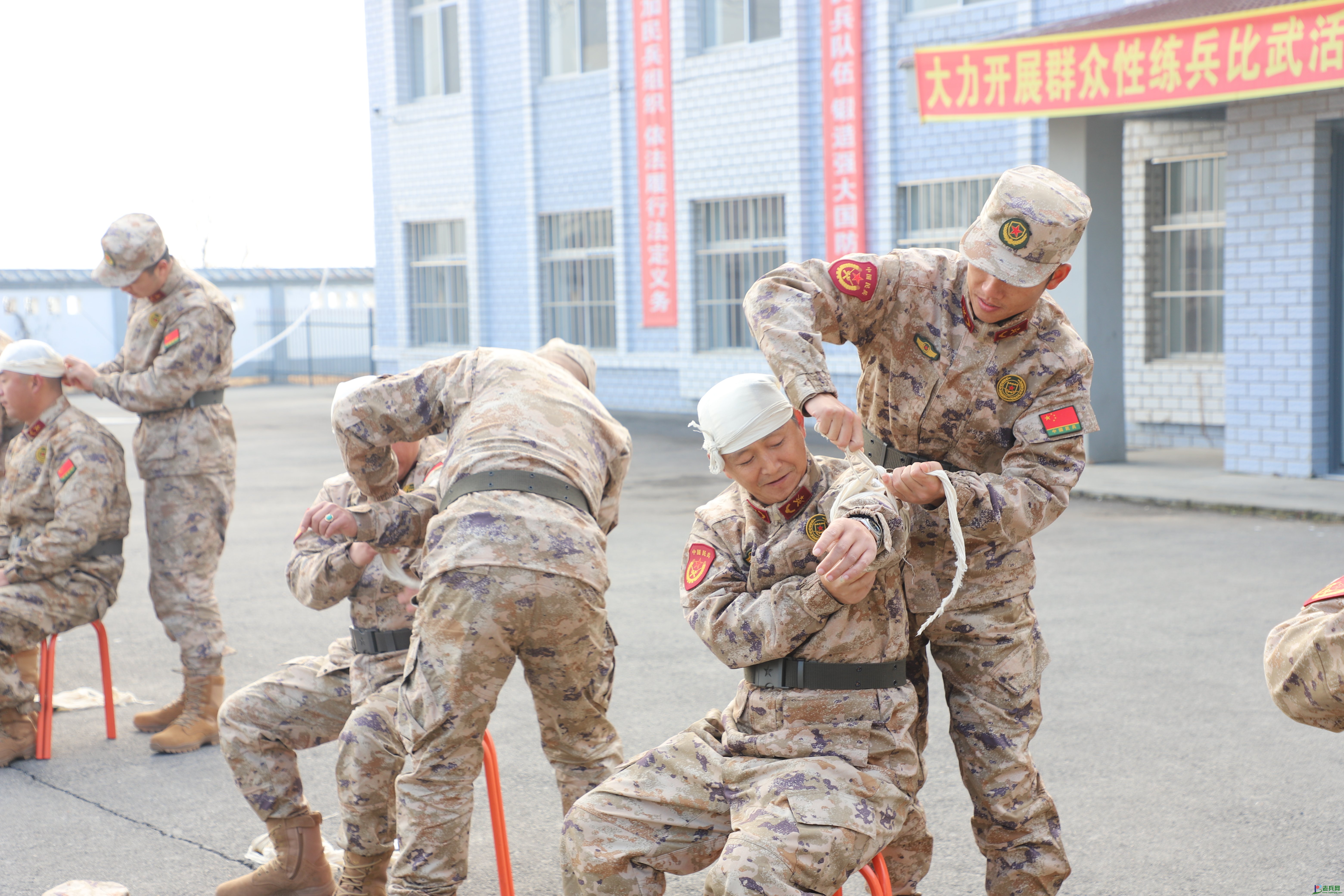 战场包扎技术训练则让民兵们掌握了基本的自救互救技能。通过模拟战场环境,民兵们学习了如何快速、准确地为伤员进行包扎处理,以减少伤亡和提高生存率。