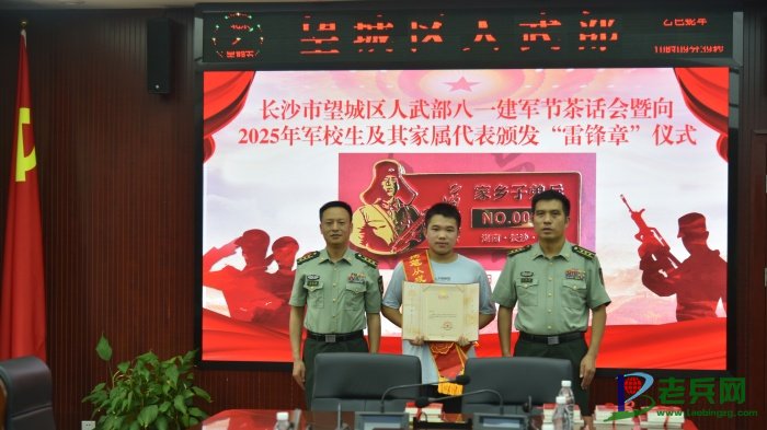 2025年八一建军节当天,雷锋家乡湖南省长沙市望城区人民武装部雷锋广场旌旗招展。望城区委常委、人武部政委文楚强,望城区人武部部长左先勇身着戎装,为2025届军校毕业生颁发“雷锋家乡子弟兵身份识别章”(简称“雷锋章”)。这枚承载着特殊使命的徽章,左侧镌刻雷锋持枪英姿,右侧标注“雷锋家乡子弟兵”字样及唯一编号,在烈日下闪耀着赤诚光芒。